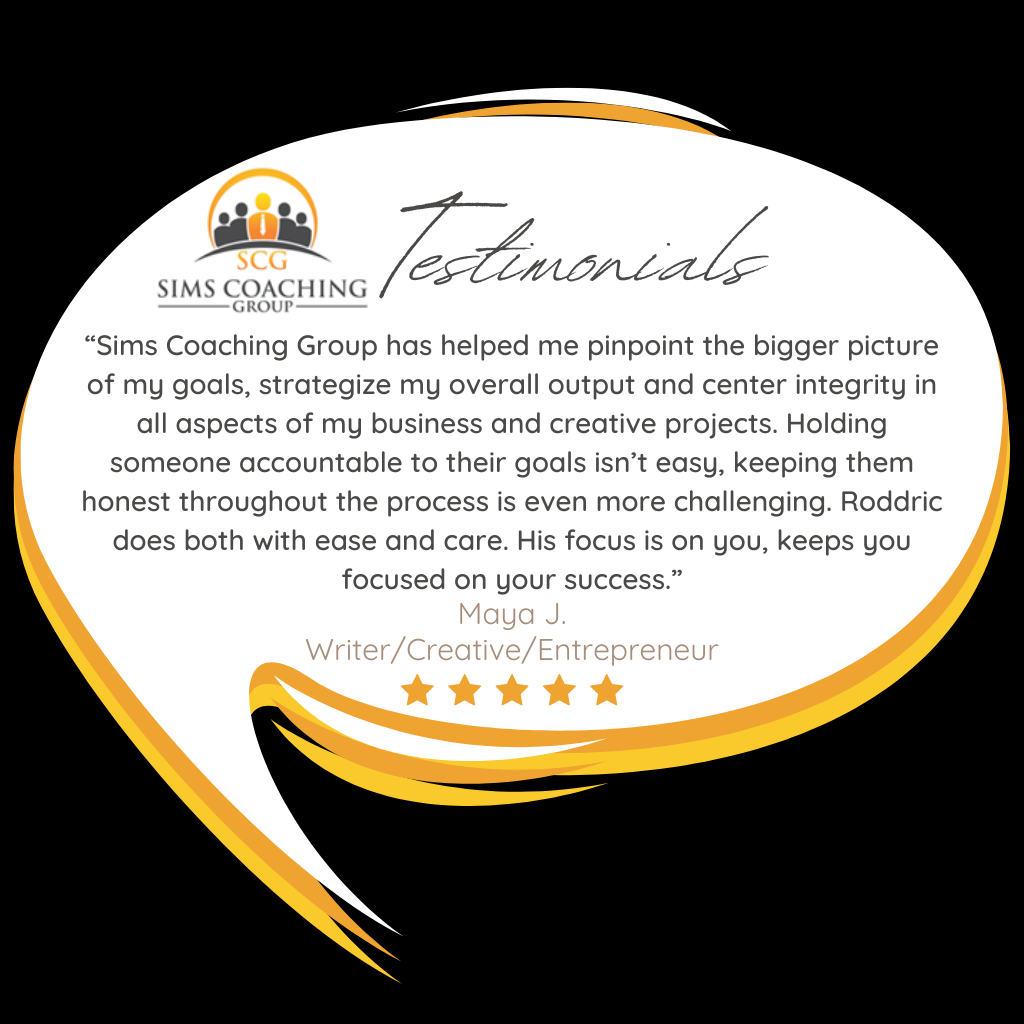 “Sims Coaching Group has helped me pinpoint the bigger picture of my goals, strategize my overall output and center integrity in all aspects of my business and creative projects. Holding someone accountable to their goals isn’t easy, keeping them honest throughout the process is even more challenging. Roddric does both with ease and care. His focus is on you, keeps you focused on your success.”