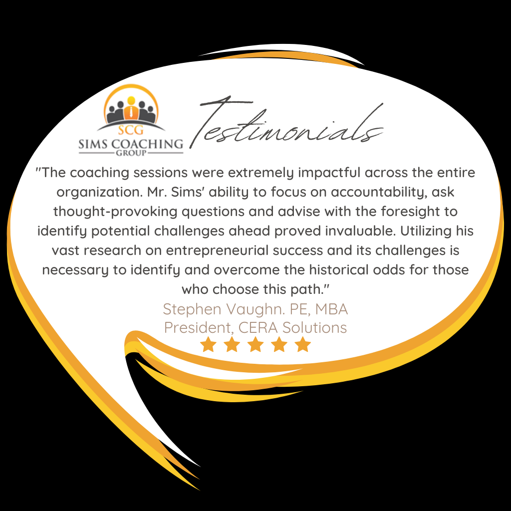 “The coaching sessions were extremely impactful across the entire organization. Mr. Sims’ ability to focus on accountability, ask thought-provoking questions and advise with the foresight to identify potential challenges ahead proved invaluable. Utilizing his vast research on entrepreneurial success and its challenges is necessary to identify and overcome the historical odds for those who choose this path.”